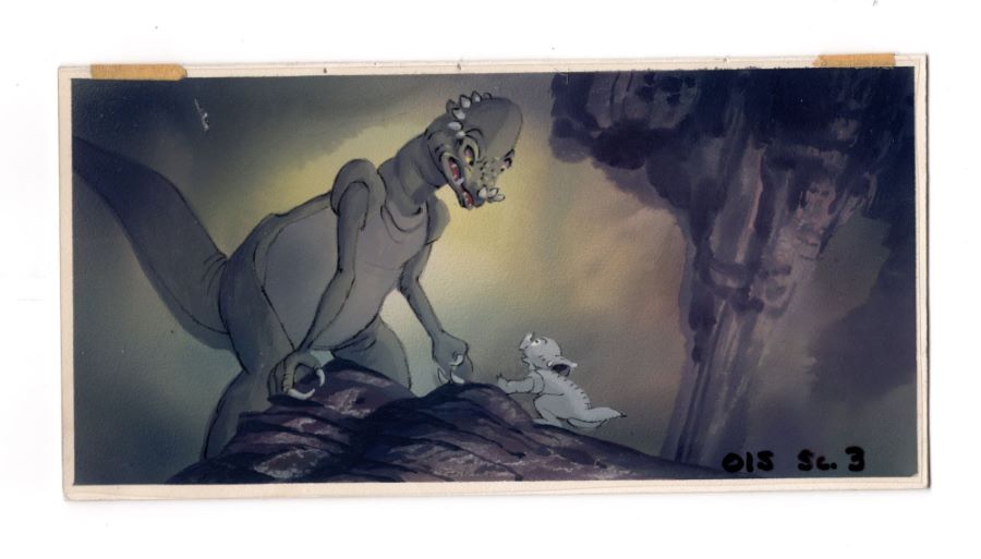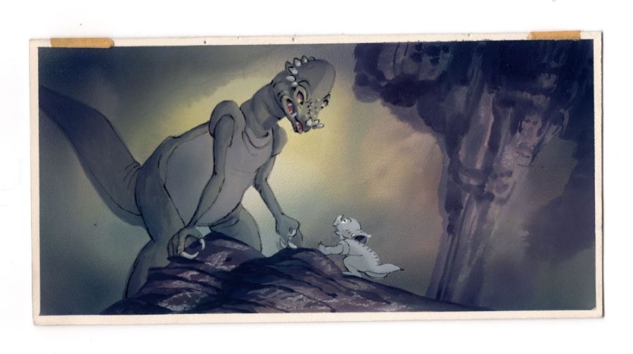 A background color key concept painting from the Don Bluth Studios production of "The Land Before Time" (1988). Featuring one of the terrifying Bonehead pachycephalosaurus trying to capture Cera, the hand-painted concept was created at the studio and used during the early production of the film. The concept was used to develop and finalize the color palette for the scene, the layout of the action, and the overall feel of the scene. When a color concept is finalized during production, it becomes the reference tool that animators would use to paint cels and backgrounds, as well as to further progress through the storyboarding and layout of the individual scenes. Measuring 4.5"x9" overall, the concept is in very good condition with minimal edge wear and pinholes in the top two corners from studio use.